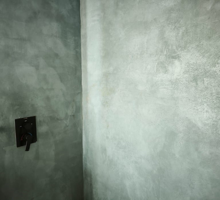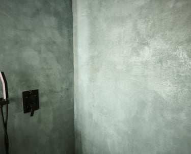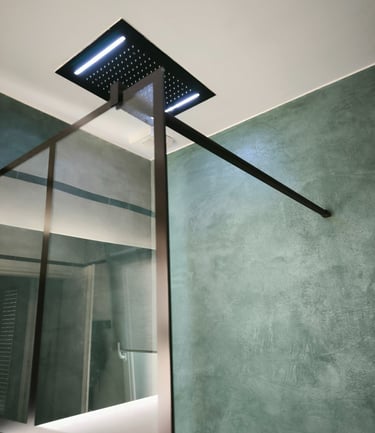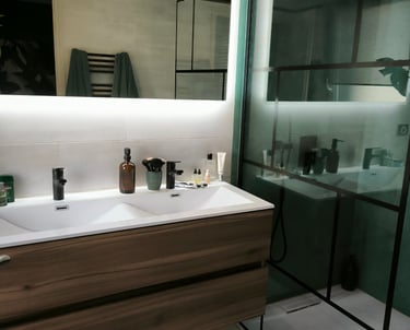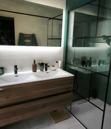 Rénovation intégrale avec réfection du mur placo, pose d'un béton au mur, incrustation de la robinetterie, remplacement du meuble vasque et ajout d'un robinet, pose d'un bac sur mesure et remplacement paroi.